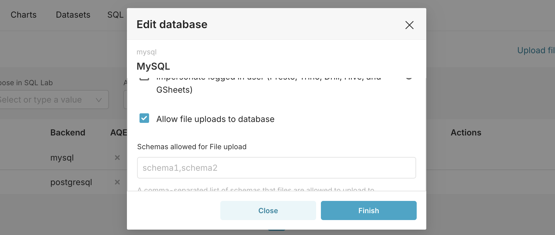 You may need to enable the functionality to upload a CSV or Excel file to your database. The following section explains how to enable this functionality for the examples database.