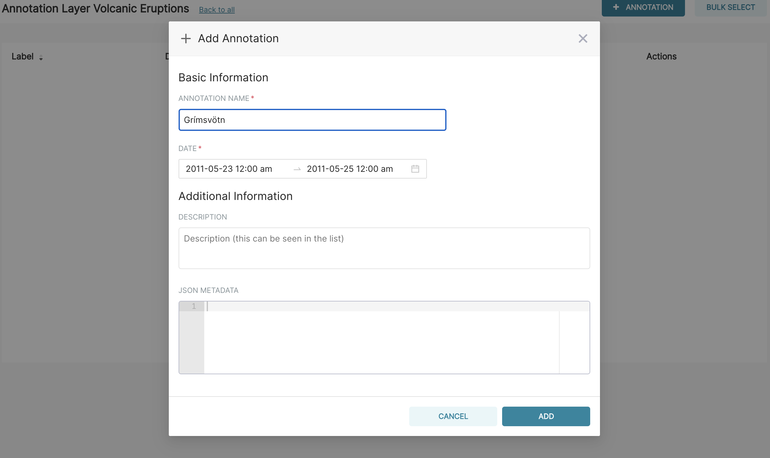 Next, add an annotation by navigating to Manage ‣ Annotations and then create a new annotation by selecting the green plus sign. Then, select the Volcanic Eruptions layer, add a short description Grímsvötn and the eruption dates (23-25 May 2011) before finally saving.