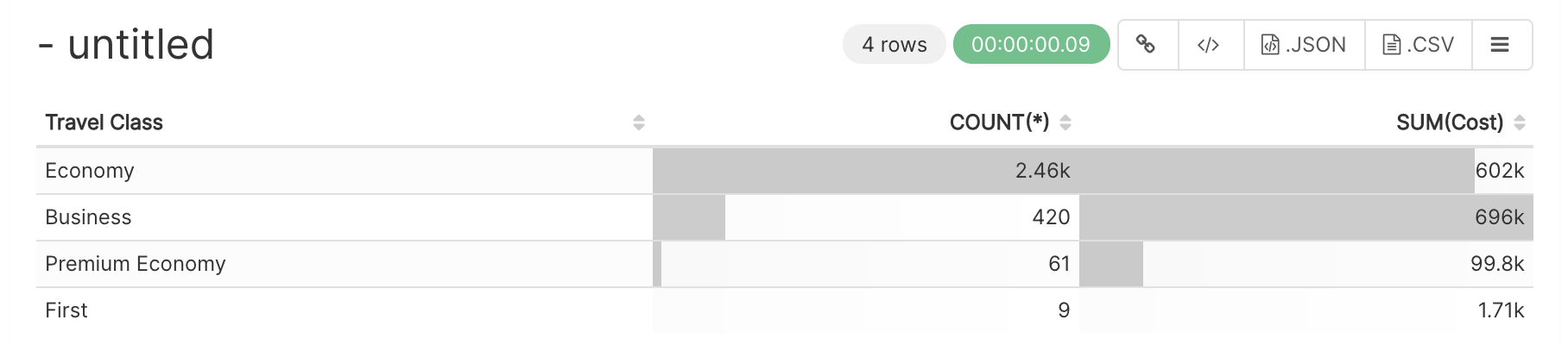 COUNT(*), which represents the number of rows in the table (in this case, quantity of flights in each Travel Class)SUM(Cost), which represents the total cost spent by each Travel Class